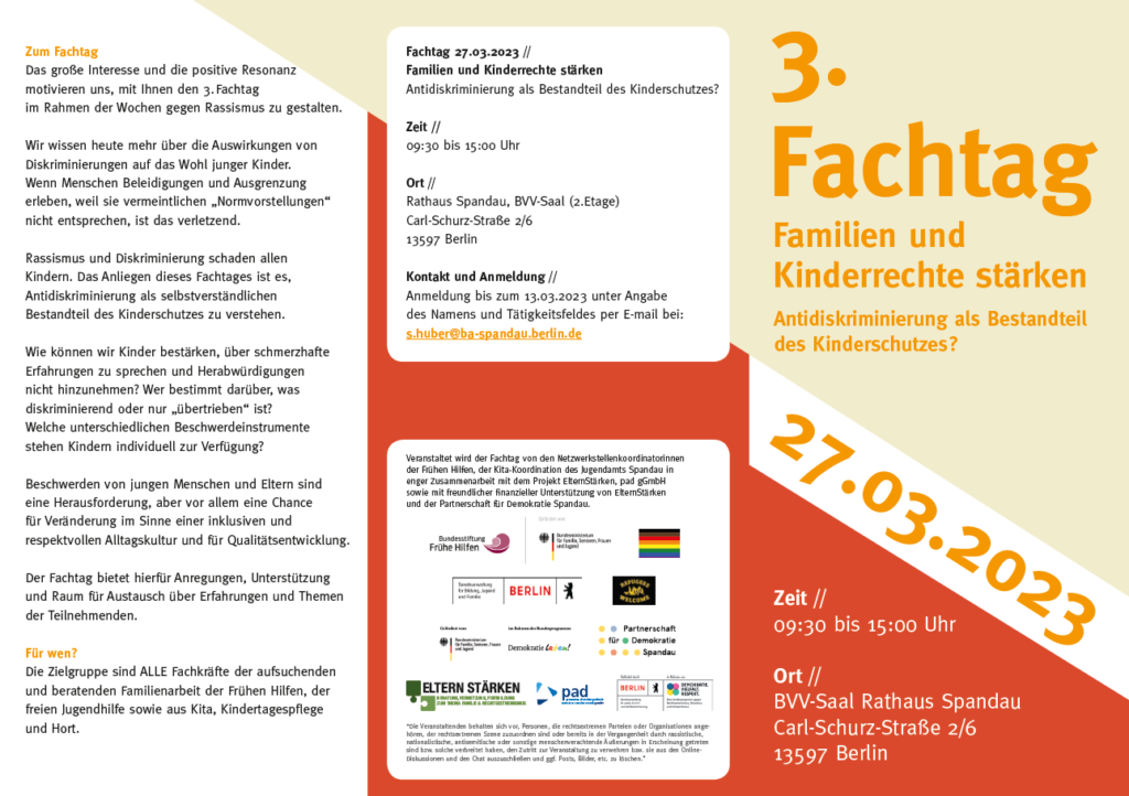 Die Frühen Hilfen organisieren in diesem Jahr den 3. Fachtag Familien stärken – Demokratie fördern – Haltung zeigen mit dem Schwerpunkt Diskriminierung als Bestandteil des Kinderschutzes. Dieser ist Teil des Aktionsmärz, dem Spandauer Mädchen*- und Frauen*-März sowie den Internationalen Wochen gegen Rassismus.