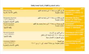 Die Übersicht der Sprechstunden kann in Arabisch, Englisch und Farsi herunter geladen werden.