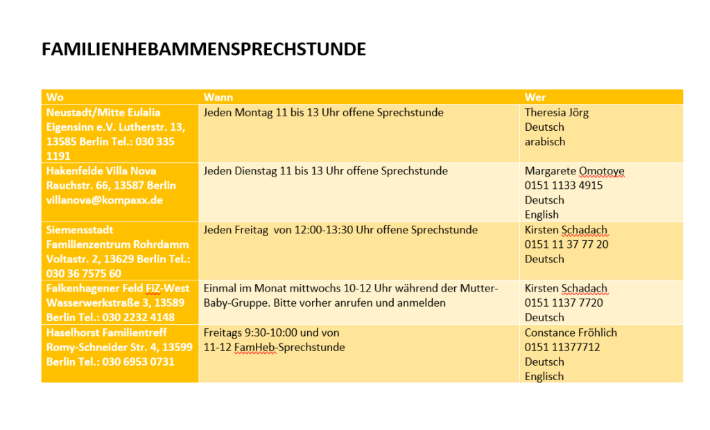 Im Bezirk Spandau gibt es offene Sprechstunden von Familienhebammen an verschiedenen Orten.